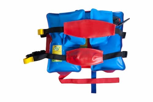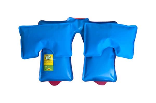 Partie amovible en U (rouge et bleu) avec coussins de maintien remplis de billes de styropor haute densité.