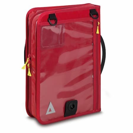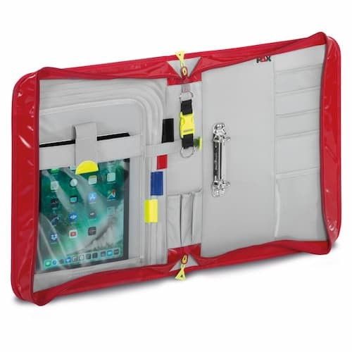Pochette multi-organiseur rouge, en PAX Plan. Rangement pour tablette, documents et stylos. Porte-bloc amovible. Imperméable et robuste.