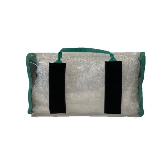 Pochette transparente avec bordure verte, 36 x 20 x 8 cm : idéale pour sacs de secours, fixation velcro et design léger.
