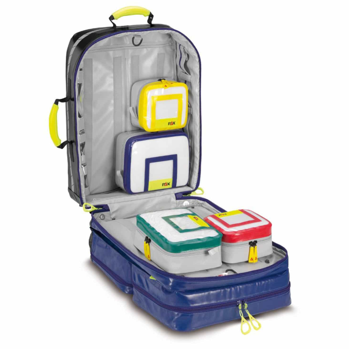 Modularité élevée : compatible avec le système PAX POS, poche internes amovibles, sangles et boucles internes codées pour organiser matériel respiratoire vs circulatoire.